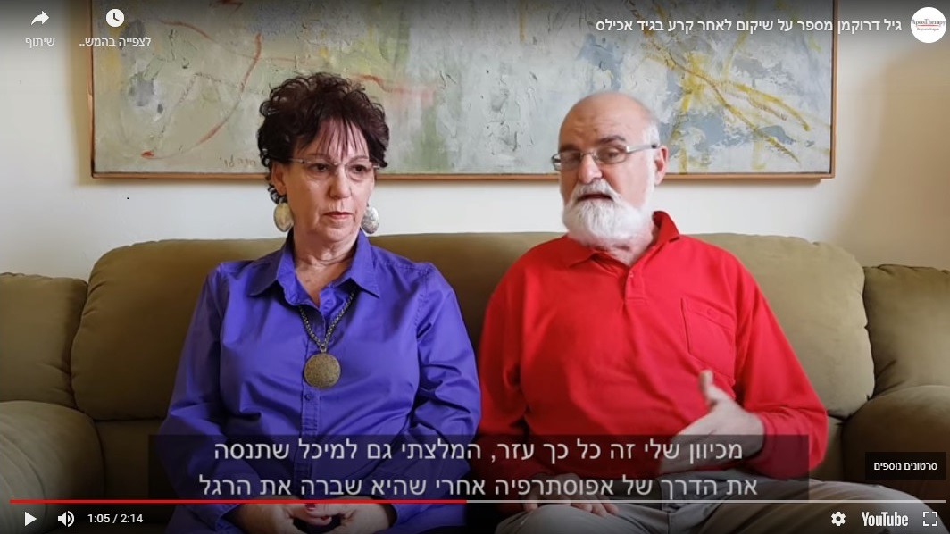 גיל דרוקמן, בן 68, קרע את גיד אכילס בעת טיול בחו”ל, ומתאר כי סבל מכאבים עזים בקרסול וצלע כל הטיול. הוא הגיע לאפוסתרפיה בעקבות המלצה של חבר לאחר שניסה כל מיני דרכים על מנת להקל על הכאב ולחזור לשגרת החיים. לאחר 4 שנים של טיפול מסת השריר שלו עלתה והוא חזר לתפקוד. לאחר שהתנסה בעצמו הוא גם המליץ לחברתו מיכל, ששברה את הרגל, להתנסות בטיפול בעצמה. צפו בסיפור ההצלחה שלהם: